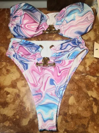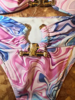 Conjunto de bikini de dos piezas con un llamativo estampado. - Diseño de dos piezas. - Estampado abstracto en tonos azules y rosas. - Detalle metálico dorado en la parte delantera.