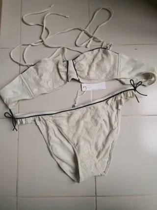 Nuevo, sin usar. Es una talla de 16 años pero es más grande, una S o M .Conjunto de bikini de dos piezas en color beige con ribetes en contraste. - Diseño triangular en la parte superior. - Braguita con tiras ajustables en los laterales.