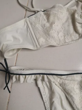 Conjunto de bikini de dos piezas con un delicado diseño de encaje. Talla pequeño, diría que equivale a una M/L. - Parte superior con tirantes ajustables. - Braguita con detalles de volantes y lazos laterales.