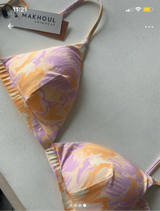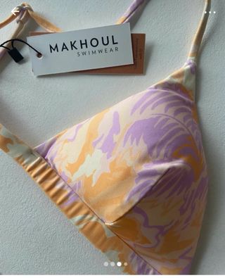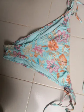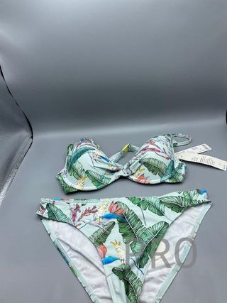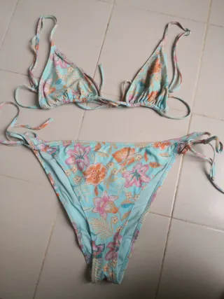 Conjunto de bikini de dos piezas de la marca Mango con un bonito estampado floral. - Top de triángulo con tiras. - Braguita con tiras laterales ajustables. - Diseño llamativo y veraniego.