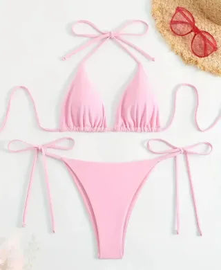 Top de bikini en color rosa con un diseño de tirantes que se anudan al cuello y a la espalda para un ajuste personalizado. - Tejido acanalado. - Copas triangulares..