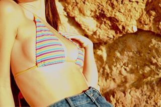 Bikini con un diseño de rayas vibrante, perfecto para disfrutar del sol y la playa. - Parte superior tipo triángulo. - Braguita con cordones laterales ajustables.