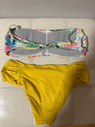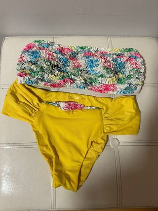 Conjunto de bikini de la marca Calzedonia. - Parte superior tipo bandeau con estampado floral. - Braguita de color amarillo. - Detalle fruncido en la parte superior.