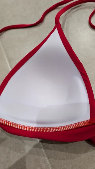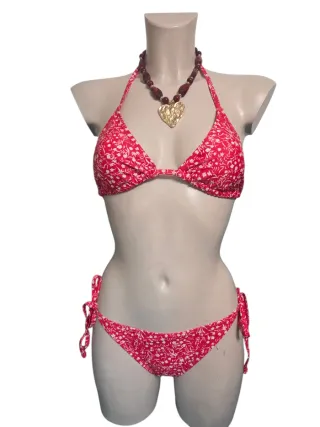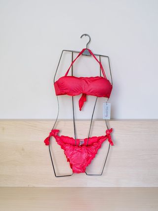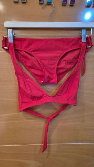 Conjunto de bikini de dos piezas en color rojo. - Parte superior tipo triángulo, talla 1 - Braguita con detalle metálico, cintura baja, talla 2 - Tirantes ajustables para atar.