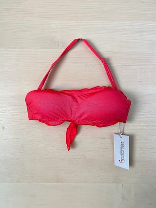 Conjunto de dos partes de arriba de bikini. - Un top tipo bandeau en color rosa palo con textura acanalada y detalle de nudo. - Un top deportivo en color fucsia con tirantes cruzados y abertura frontal.