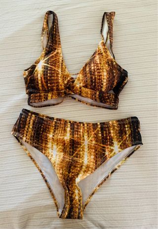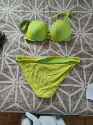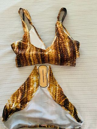Conjunto de bikini de la marca Calzedonia, con un diseño brillante y llamativo. - Tejido con acabado escamado. - Tirantes ajustables. - Talla XS (34/6). -Sujetador talla 85