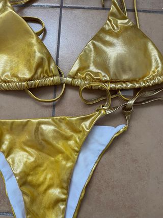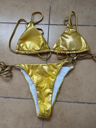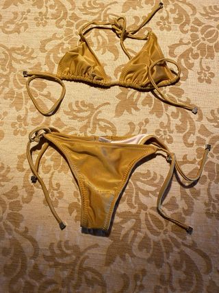 Bikini con un bonito color dorado. El top es de triángulo y se anuda al cuello y a la espalda. La braguita es de corte brasileño y también se anuda a los laterales. - Tejido suave y brillante. - Diseño ajustable.