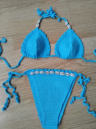 Bikini de dos piezas hecho a mano con ganchillo. - Diseño de triángulo en el top. - Adornado con conchas marinas. - Tiras ajustables para un calce perfecto. - Braguita con detalle de conchas en la cintura.