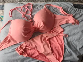 Conjunto de bikini de la marca Hunkemöller. - Talla 95E. - Color rosa. - Detalle de abalorios dorados en la parte delantera del sujetador. - Tirantes ajustables. - Braguita con cordones laterales, talla L