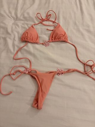 Conjunto de bikini en color rosa con detalles de flores. - Diseño de tiras ajustables. - Adornos florales en la parte delantera del top y la braguita. - Braguita de corte brasileño.