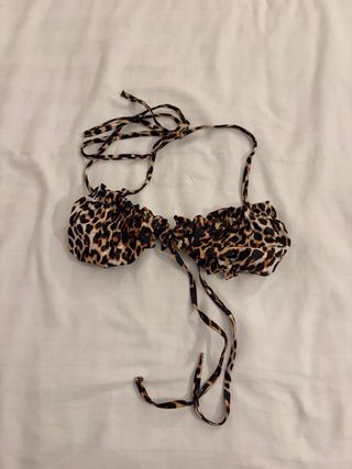 Top de bikini con un llamativo estampado de leopardo. Perfecto para combinar con tus braguitas favoritas. - Diseño con volantes. - Tirantes ajustables para atar al cuello y espalda.