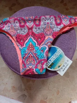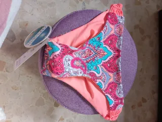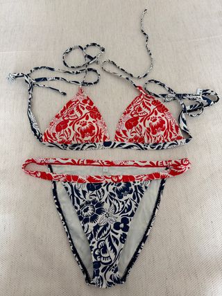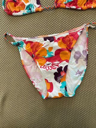 Bikini de dos piezas sin estrenar(sin etiqueta porque se lavó), talla 44-46. Presenta un estampado vibrante en la parte superior y un color liso en la parte inferior. - Parte superior con diseño tipo halter. - Braguita con cordones laterales ajustables.