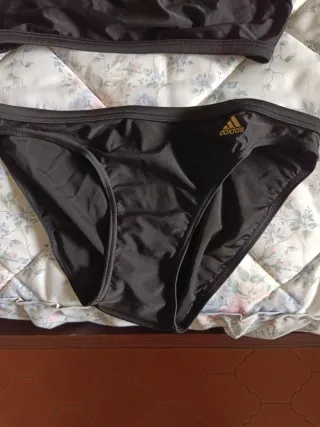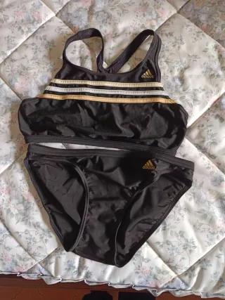 Conjunto deportivo de bikini Adidas. - Top con tirantes cruzados en la espalda. - Detalles de rayas doradas y plateadas en el top. - Braguita de corte clásico.