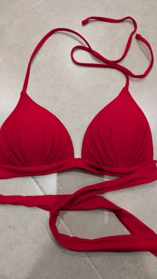 Sujetador de bikini de color rojo. Tiene un diseño con copas triangulares y tiras para atar. - Copas triangulares. - Tiras ajustables para cuello y espalda.