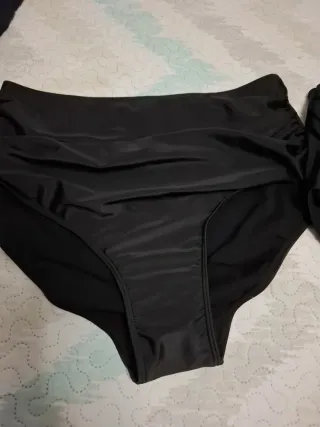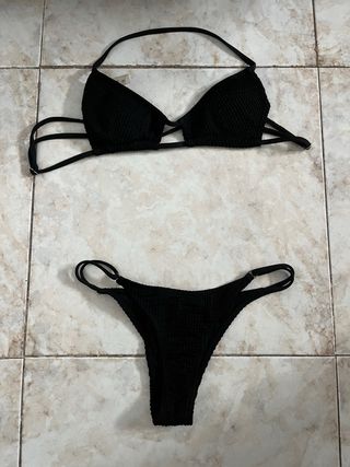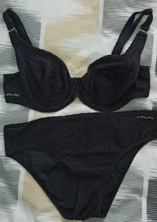 Conjunto de bikini de dos piezas negro, braga talla L y sujetador talla XL ( vale para una 110 de pecho ) - Diseño texturizado. - Tirantes ajustables. - Detalle metálico en los tirantes.