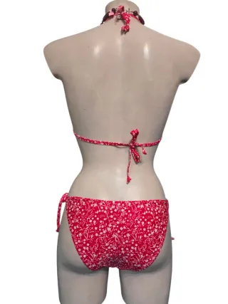 Conjunto de bikini con un alegre estampado floral. - Parte superior tipo triángulo con tiras al cuello. - Braguita con lazos laterales ajustables. - Diseño llamativo y veraniego.