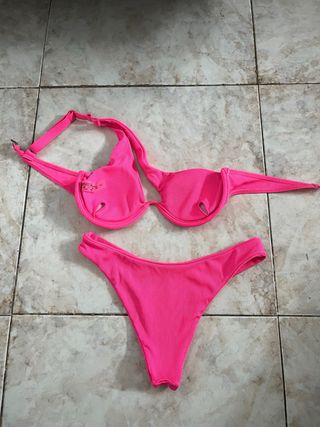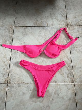 Precioso bikini de color rosa - Forro interior - Braga (32cm). Top triangular ajustable con cordón
