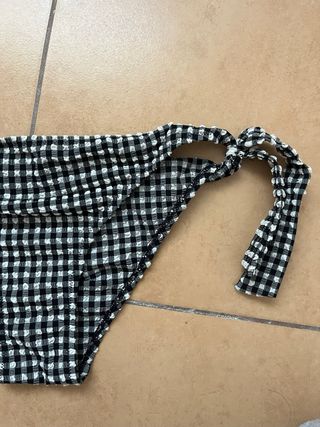Bikini de dos piezas con estampado de cuadros. - Parte superior con nudo frontal y tirantes ajustables. Se abrocha con broche y lazo. - Braguita con lazos laterales para ajustar. - Tejido texturizado. La parte de arriba es la M y la de abajo la L.