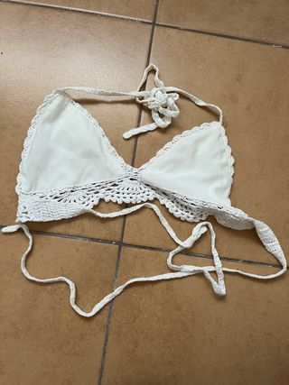 Sujetador de bikini tejido a mano con un diseño de crochet. - Acabado con un borde festoneado. - Tirantes ajustables para atar al cuello y espalda. - Con forro. Lo compré cono un biquini de crochet pero podría usarse como un top.