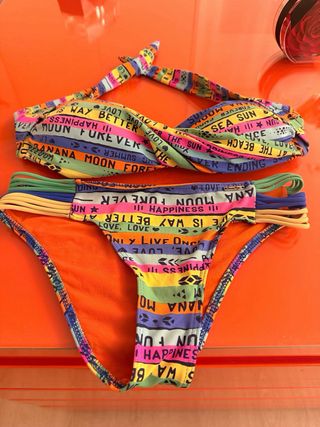 Bikini de la marca Banana Moon con un diseño vibrante y alegre. - Estampado multicolor con texto. - Tirantes ajustables. - Braguita de corte clásico.