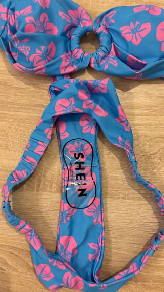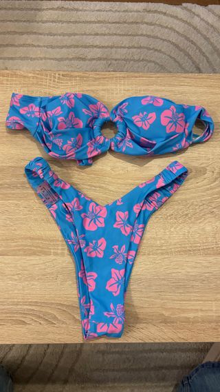 Conjunto de bikini con estampado de flores. - Top tipo bandeau con detalle de anilla. - Braguita de corte brasileño. - Diseño llamativo en azul y rosa.