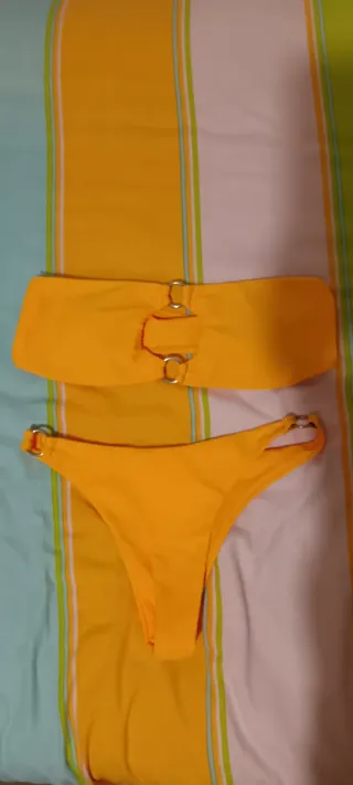Conjunto de bikini estilo brasileño con un diseño llamativo. - Parte superior tipo bandeau con detalle de lazo. - Braguita con corte favorecedor y doble tonalidad. - Tejido suave y elástico. - Tengo disponible talla P y M.