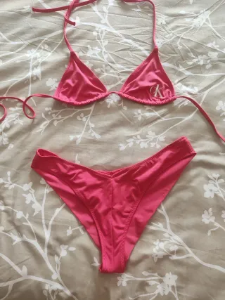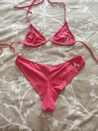 Bikini de la marca Calzedonia en color rosa. - Top talla 3 ( equivale a una 90) y braguita brasileña reversible 2 ( S). - Diseño moderno y cómodo.