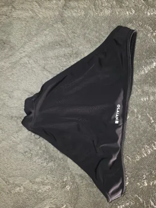 Conjunto de bikini de Shein (Talla M) en color negro con tejido de canalé. Un básico ideal que favorece muchísimo. Top (Talla M): Estilo triangular con detalle de doble tira frontal y tirantes regulables. Solo tiene 1 uso, está como nuevo. Braguita (Talla M): Corte tipo brasileño. Está totalmente nueva, nunca se ha llegado a usar, aunque ya no conserva el adhesivo protector higiénico (se quitó al recibirlo). Está impecable y recién lavada por higiene. Tejido: Canalé elástico, muy cómodo y de secado rápido. Material: 82% poliéster, 18% elastano. Venta por falta de uso. ¡Hago envíos muy rápidos!