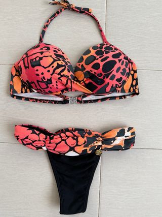 Bikini brasileño con un vibrante estampado floral. - Diseño triangular en la parte superior. - Braguita estilo brasileño. - Tiras ajustables para un ajuste perfecto. Usado una vez. 89,9 poliamida y 15,1 elastano, forro 100% poliamida