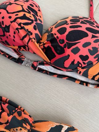 Conjunto de bikini de la marca Oysho con un llamativo estampado de leopardo. - Diseño de dos piezas. - Estampado en tonos beige y negro. -Parte de arriba de banda con tirantes extraíbles y se anuda con un lazo -Parte de abajo, brasileño -Es del Oysho pero no tiene etiquetas, se las quite porque molestaban