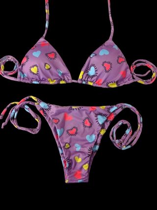 Bikini Brasileño Nuevo con etiquetas y protección higiénica 🏷️ Talla: M Color: Morado con estampado de corazones TOP estilo cortinilla, con relleno fijo, con tirantes para amarrar en la espada y amarrar en el cuello. TANGA para amarrar en las laterales Marca: Vicio de Praia Lycra de muy buena calidad 👉Tengo más bikinis brasileños, de otros colores, y tallas en mi perfil. 🎁 Te invito a visitar mi armario, tengo más bikinis brasileños 😊 📦 Envío rápido y bien embalado 📦 #bikinibrasil #bikinibrasileiro #bikinibrasileño #brasil #brazil