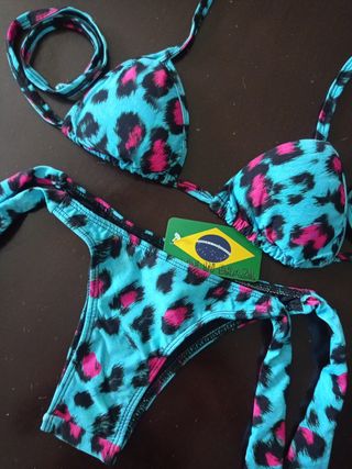 Bikini Brasileño Nuevo con etiquetas 🏷️ Color: Estampado Animal Print Brasileño Rosa 🩷 y Negro 🖤 TOP: estilo cortinilla con relleno fijo TANGA: para amarrar en las laterales TALLA: P brasileña (viste una S) Marca: Brazilian Boutique Lycra de muy buena calidad. 92% Poliéster 8% Elastano Forro 100% Poliamida. 🎁Te invito a visitar mi perfil, tengo más cosillas que te puede interesar 😊 📦 Envío rápido y bien embalado 📦 #bikini #bikinis #tallas #bikinibrasil #bikinibrasileño #bikinibrasileiro #nuevoconetiqueta