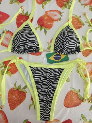 Bikini Brasileño Nuevo con etiquetas 🏷️ Color: Amarillo neón estampado negro TOP: estilo cortinilla con un poquito de relleno removible. TANGA: para amarrar en las laterales TALLA: M brasileña Marca: RioBKN Brasil 👉 TALLAS DISPONIBLES: P, M, L y GG brasileño 👉 S, M, L y XL 🚨Escríbeme indicando la talla deseada🚨 Lycra de muy buena calidad. 90% Poliamida 10% Elastano Forro 100% Poliamida. 🎁 Te invito a visitar mi perfil, tengo más bikinis brasileños 😊 📦 Envío rápido y bien embalado 📦 #bikini #bikinis #tallas #bikinibrasil #bikinibrasileño #bikinibrasileiro #nuevoconetiqueta