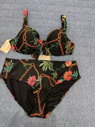 Conjunto de bikini con un vibrante estampado floral. Top bikini M( 90) aunque podría utilizarse perfectamente para una 95, da talla, braguita brasileña S, ambas piezas forradas con etiqueta, cómodo, elegante y favorecedor.
