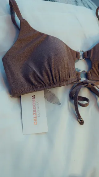 Top de bikini de la marca Calzedonia en color marrón con un toque brillante. Tiene detalles de aros metálicos y tiras ajustables. NUEVO CON ETIQUETAS A ESTRENAR.