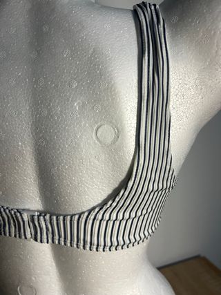 Biquini de rayas azules y blancas de la marca TEX. Parte de arriba talla 90B, parte de abajo talla 40. Usado en buen estado.