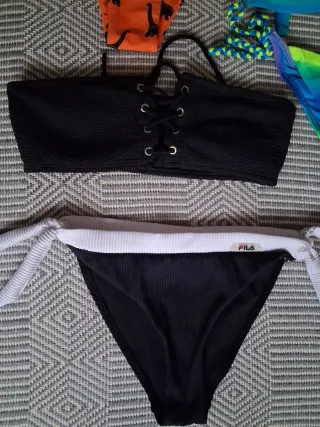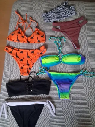 Conjunto de varios bikinis con diferentes estampados y diseños. Todos por 5 eur - Bikini naranja con estampado de dinosaurios. - Bikini negro con cordones. - Bikini con estampado de rayas blancas y negras. - Bikini marrón con tiras. - Bikini con degradado de colores (verde, azul, morado).