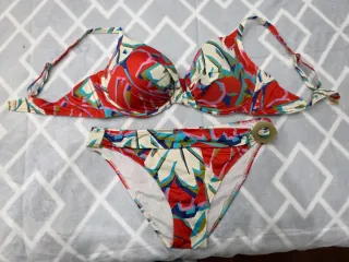 Conjunto de bikini con un vibrante estampado floral. - Diseño de tirantes cruzados en el top. - Braguita de corte brasileño. - Tejido elástico y cómodo. nunca lo usé me quedó grande