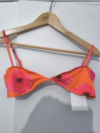 Precioso top de bikini con un vibrante estampado floral. - Diseño con tirantes finos. - Detalle de flores grandes en tonos naranja y rosa. - Etiqueta de la marca visible.