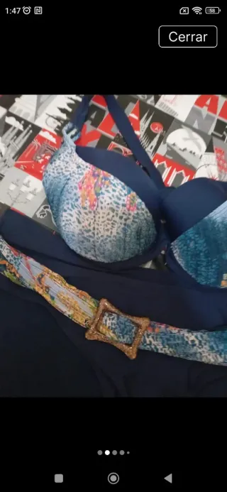 Conjunto de bikini de dos piezas. El sujetador es tipo floral talla 2XL ( comprado por error) gasto talla L Y braguita rosa talla L pero talla más grande porque me viene grande
