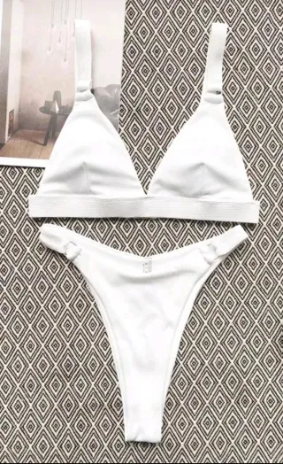Conjunto de bikini de dos piezas en color blanco TOTALMENTE NUEVO (bolsa original) Diseño moderno y muy cómodo Top Triángulo: con tirantes ajustable Braguita Brasileña: De corte muy favorecedor con detalles en los laterales que estilizan la figura. Tejido de muy buena calidad con forro interior (NO transparenta) Detalles en plateado Talla S / 36 (un poco grande) Con Relleno: Copas que dan una forma muy bonita (extraíbles) Perfecto para tus vacaciones, pool parties o días de playa. Escríbeme si tienes cualquier duda! #BikiniBlanco #Shein #BikiniS #ModaBaño #BikiniBrasileño #NuevoConBolsa #BikiniPlateado #BeachReady #EstiloPinterest