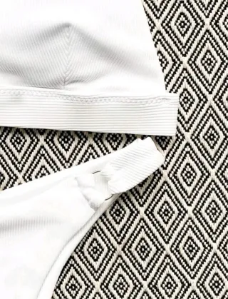 Bikini de dos piezas en color blanco, con un diseño texturizado. Talla S (tallaje grande) - Parte superior de triángulo con tiras ajustables. - Braguita con tiras laterales y decoraciones metalicas con brillantitos (estan precintados, mirar la foto de la modelo donde se ven como son)) - Tejido con relieve. Con forro -Con decoraciones metalicas brillantitos (estan precintadas con papel) En la web vale 35 euros. Nuevo a estrenar con etiqueta y embalaje