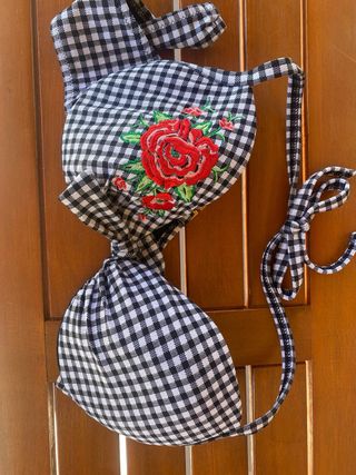 Bonito bikini de dos piezas, en blanco y negro a cuadros. - Tiene un bonito bordado de rosas rojas. - La parte superior del bikini está en perfecto estado.