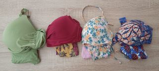 Dos partes de arriba de ropa de baño (el de color negro ya está vendido) Talla 90A. Todos ajustables, aros y copas de relleno para realzar busto. Mismo modelo solo cambian diseños y colores: ❤️Burdeos/granate: de anudar en cuello y espalda. Encaje y puntilla. Tiene dos usos, está como nuevo.8€ 💐Flores: blanco y florecitas de colorines neón, en tonos lima, coral, lila y verde. Detalle de lazo delantero o para atar al cuello, con dos flores doraditas. Usado una sola vez, está nuevísimo.7€ *También vendo unidades sueltas. Más en mi perfil!