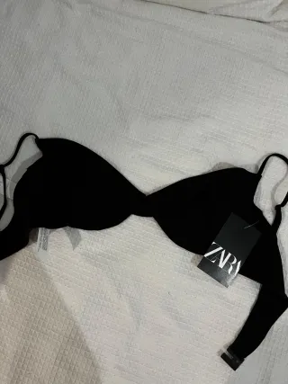 Bikini de la marca Zara en color negro. Parte de arriba - Diseño con copas. - Tirantes ajustables. - Nuevo sin estrenar, con etiqueta