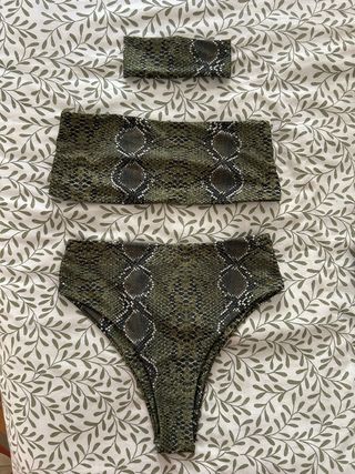 Conjunto de bikini con estampado de serpiente en tonos verdes y negros. Incluye tres piezas. - Top tipo bandeau. - Braguita de tiro alto. - Cinta para la cabeza a juego.