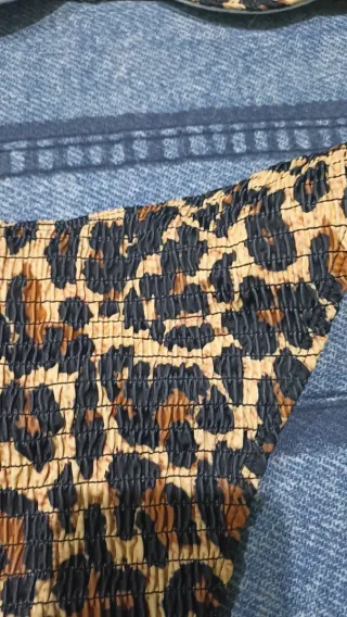 Bikini con estampado de leopardo en tonos azules y multicolores. El top cuenta con un detalle de volantes en la parte superior. Talla 40 Marca Kamu. No hago envíos. Entrego en Barcelona