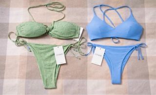 Pack de dos conjuntos de bikini de la marca Oysho, ambos a estrenar. - Un bikini en color verde con estampado. - Un bikini en color azul. - Talla única.