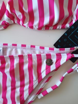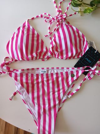 Bikini Rutz a rayas en tonos rosas y blancos. Está nuevo, sin usar. - Diseño de triángulo. - Incluye braguita y parte superior. - Material suave y agradable al tacto. La braguita es un poco pequeña ,