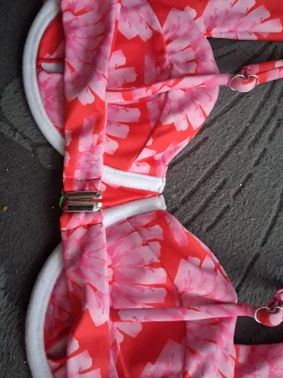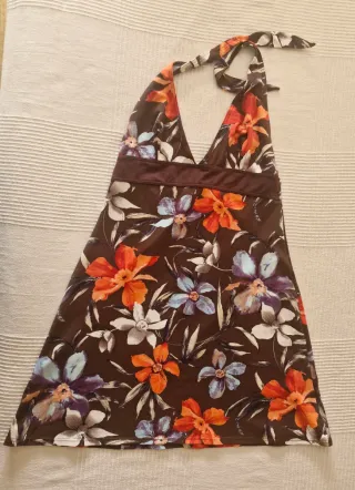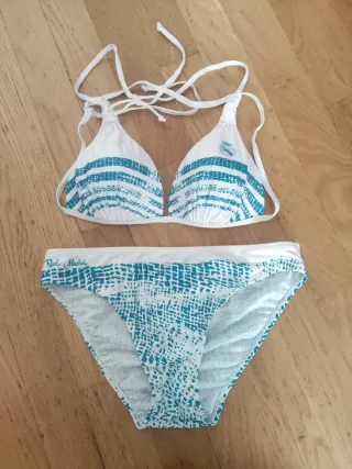 Bikini de dos piezas con un vibrante estampado floral. Usado en buen estado. Talla 40 en etiqueta pero queda como una 38, tener en cuenta - Diseño triangular en la parte superior. - Braguita de corte clásico. - Tiras negras para atar.